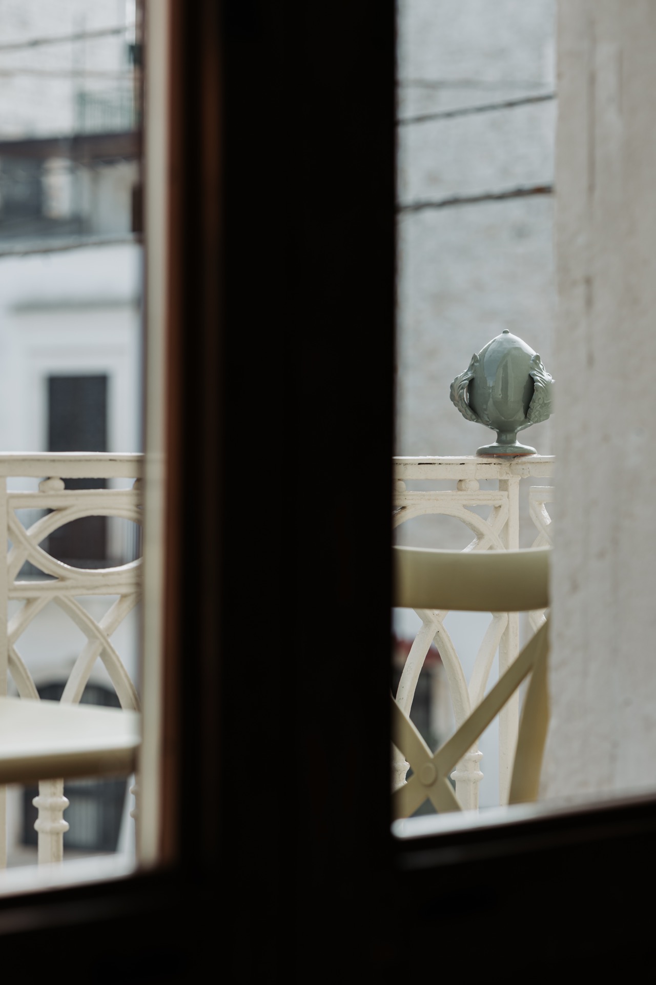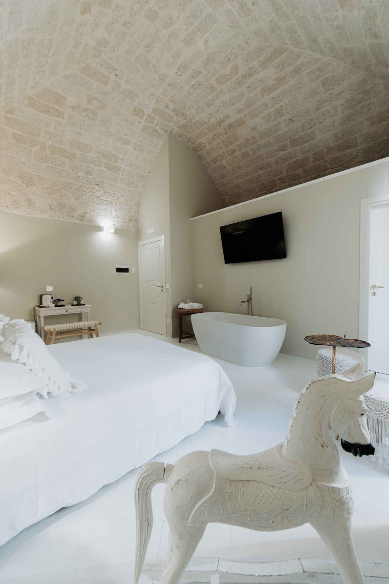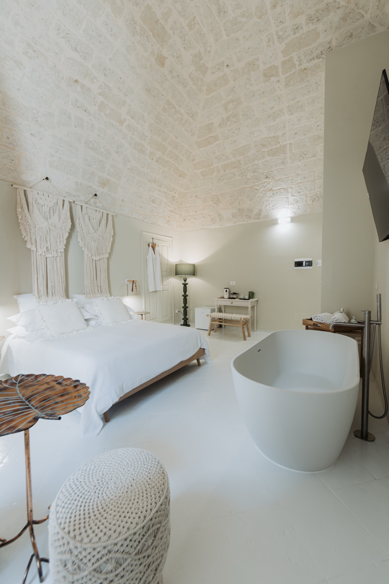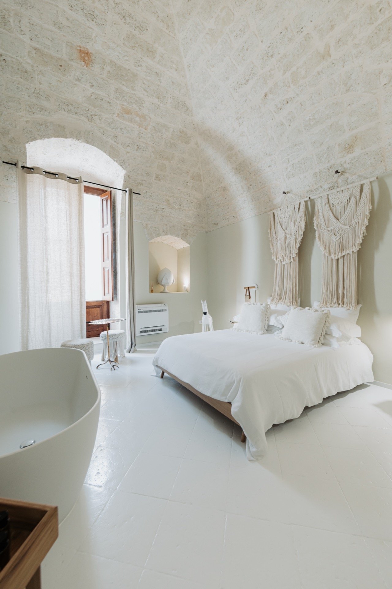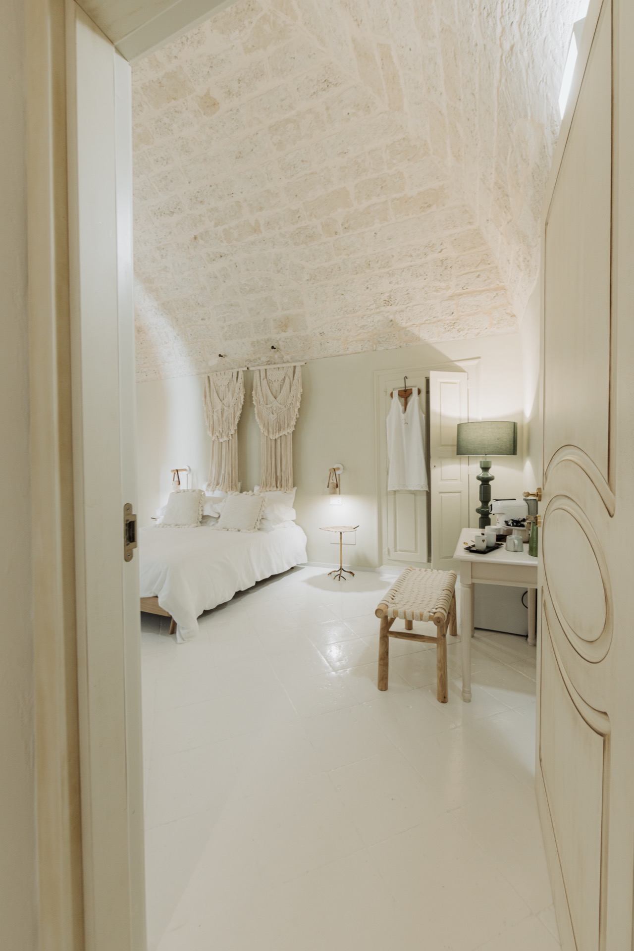 La grande volta in tufo si apre sopra uno spazio arioso e luminoso. Le pareti neutre amplificano la luce naturale, mentre sopra il letto domina una scenografica composizione in macramè che richiama la manualità e la tradizione artigianale.