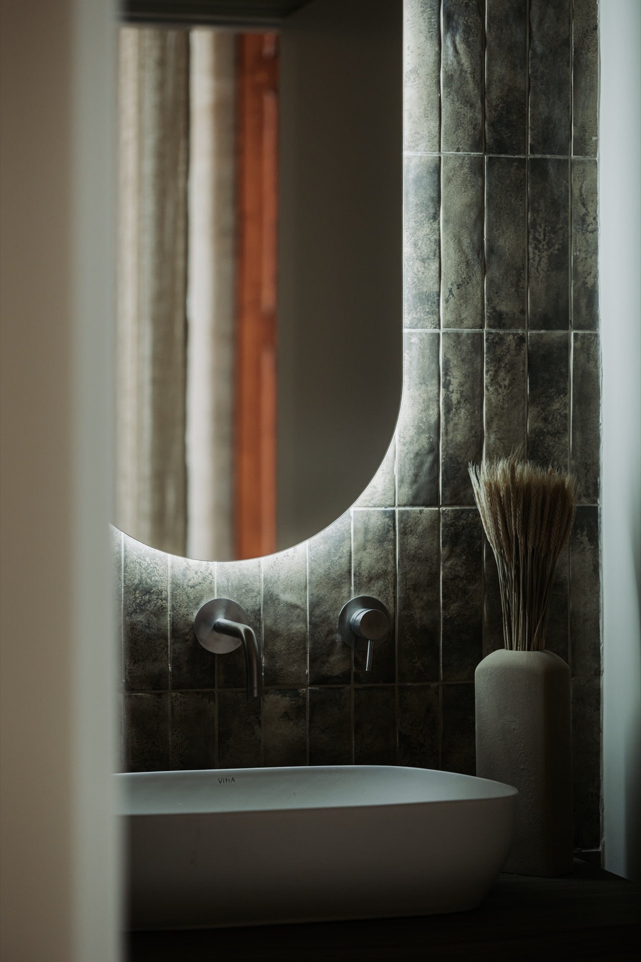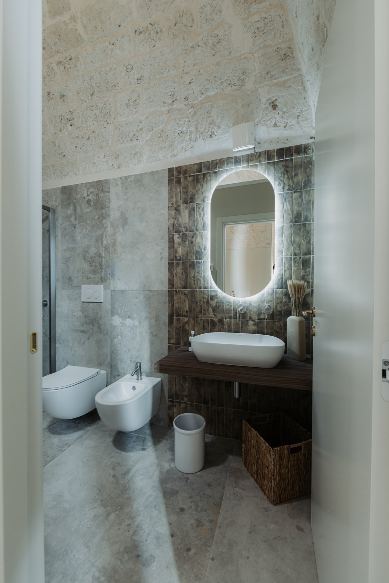 Il bagno, rivestito in gres materico nei toni profondi del marrone-grigio, è valorizzato da uno specchio retroilluminato che crea un’atmosfera morbida e sofisticata.