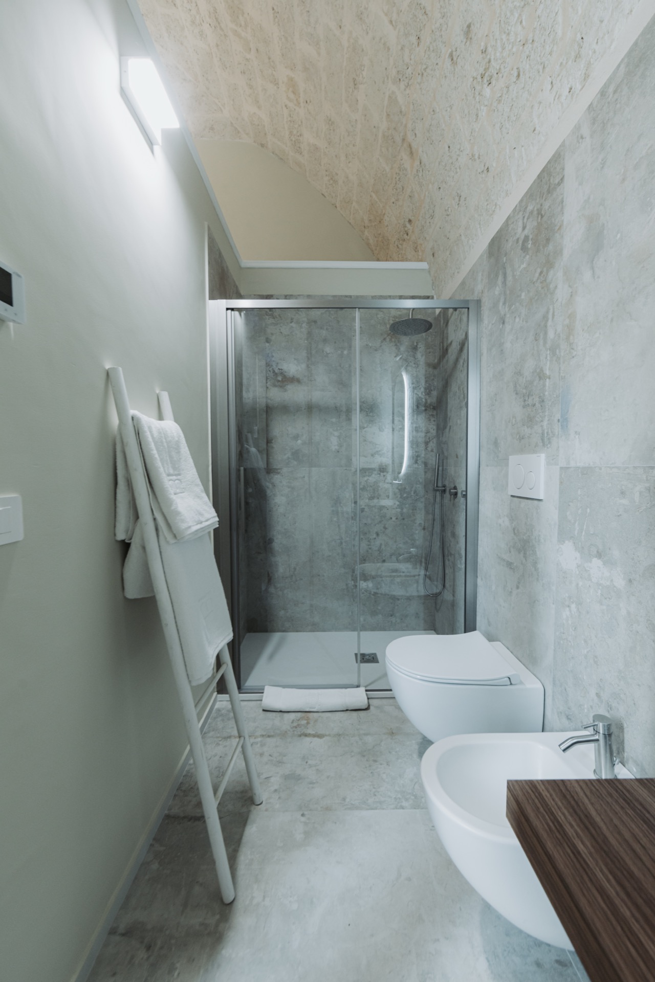 Macramè è luce e verticalità. La grande volta in tufo si apre sopra uno spazio arioso e luminoso. Le pareti neutre amplificano la luce naturale, mentre sopra il letto domina una scenografica composizione in macramè che richiama la manualità e la tradizione artigianale. La vasca freestanding, integrata nella zona notte, rende l’ambiente intimo e rilassante,…